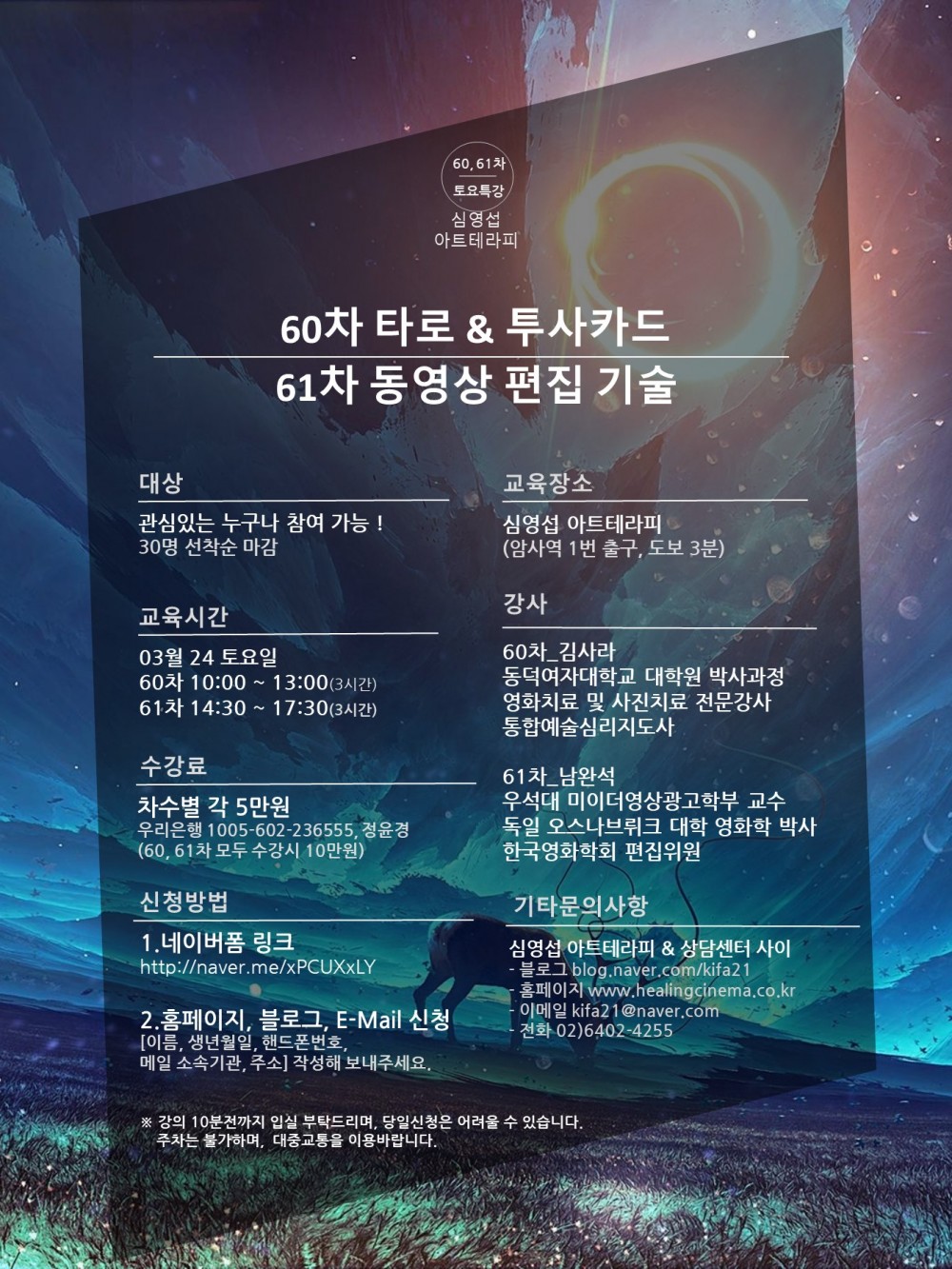 안녕하십니까! 저희 심영섭 아트테라피에서 3월 24일에 토요특강을 개최합니다. 오전에는 진행김사라 선생님을 모시고 ’타로카드와 투사카드‘을 주제로 하여 타로를 모르는 분들이라도 타로를 사용하여 상담에 활용하는 방법에 대해서 강의를 진행하고, 오후에는 남완석 교수님을 모시고 ’클리핑‘을 주제로 하여 동영상을 편집하고 실습하는 강의를 할 예정입니다.
