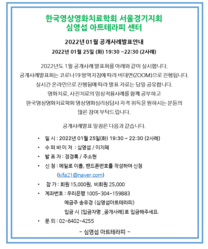 [공개사례발표] 2022.01.25(화) 19:30 ~ (zoom) 페이지 정보 작성자 최고관리자 작성일21-12-24 11:27 조회7,549회 댓글0건 이메일 kifa21@naver.com휴대폰번호 http://healingcinema.co.kr/ 관련링크 이전글 다음글 목록 본문 22년 1월 25일 공개 사례 발표가 열립니다. 신청은 메일로 접수받고 있습니다. 댓글목록 등록된 댓글이 없습니다. 이전글 다음글 목록